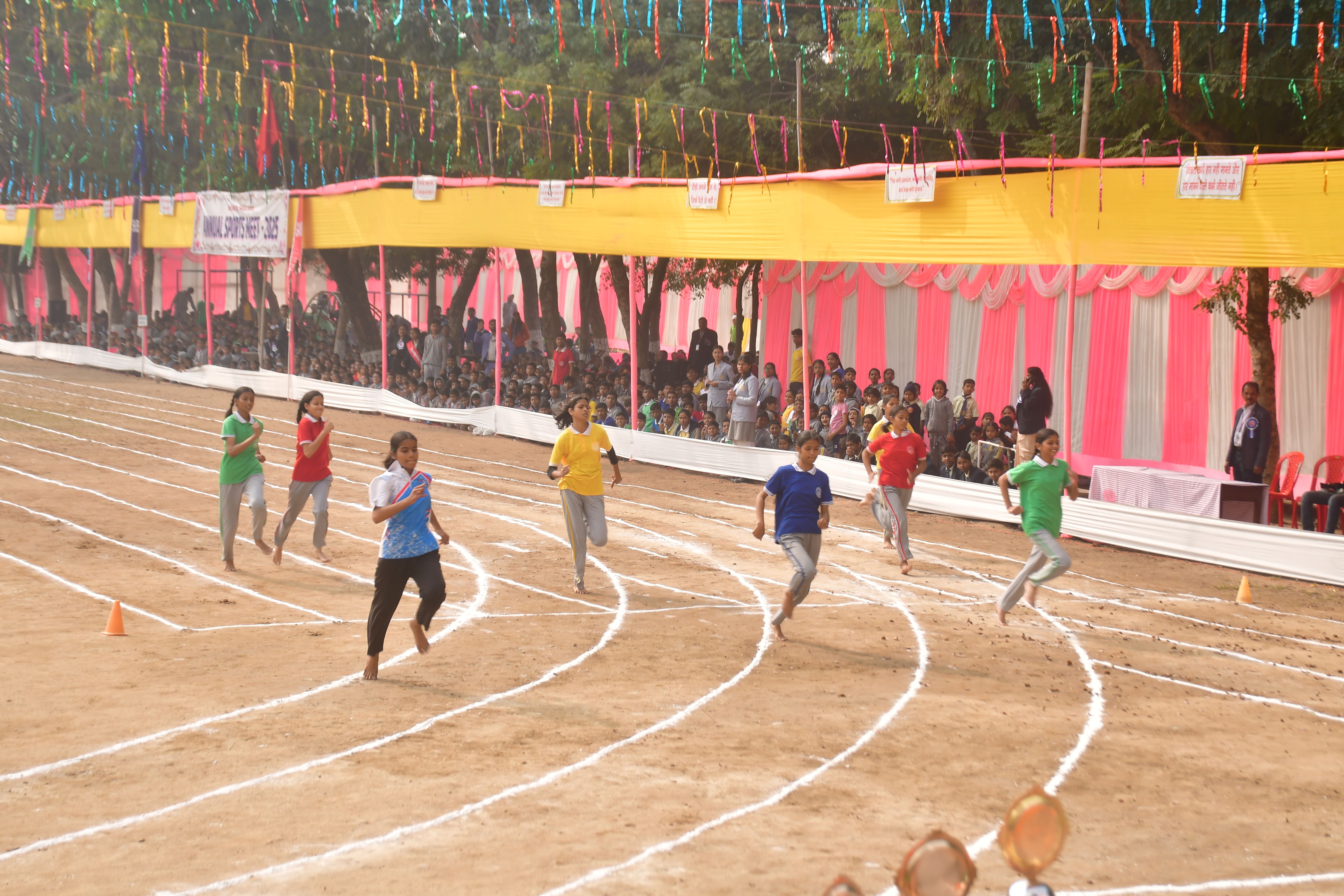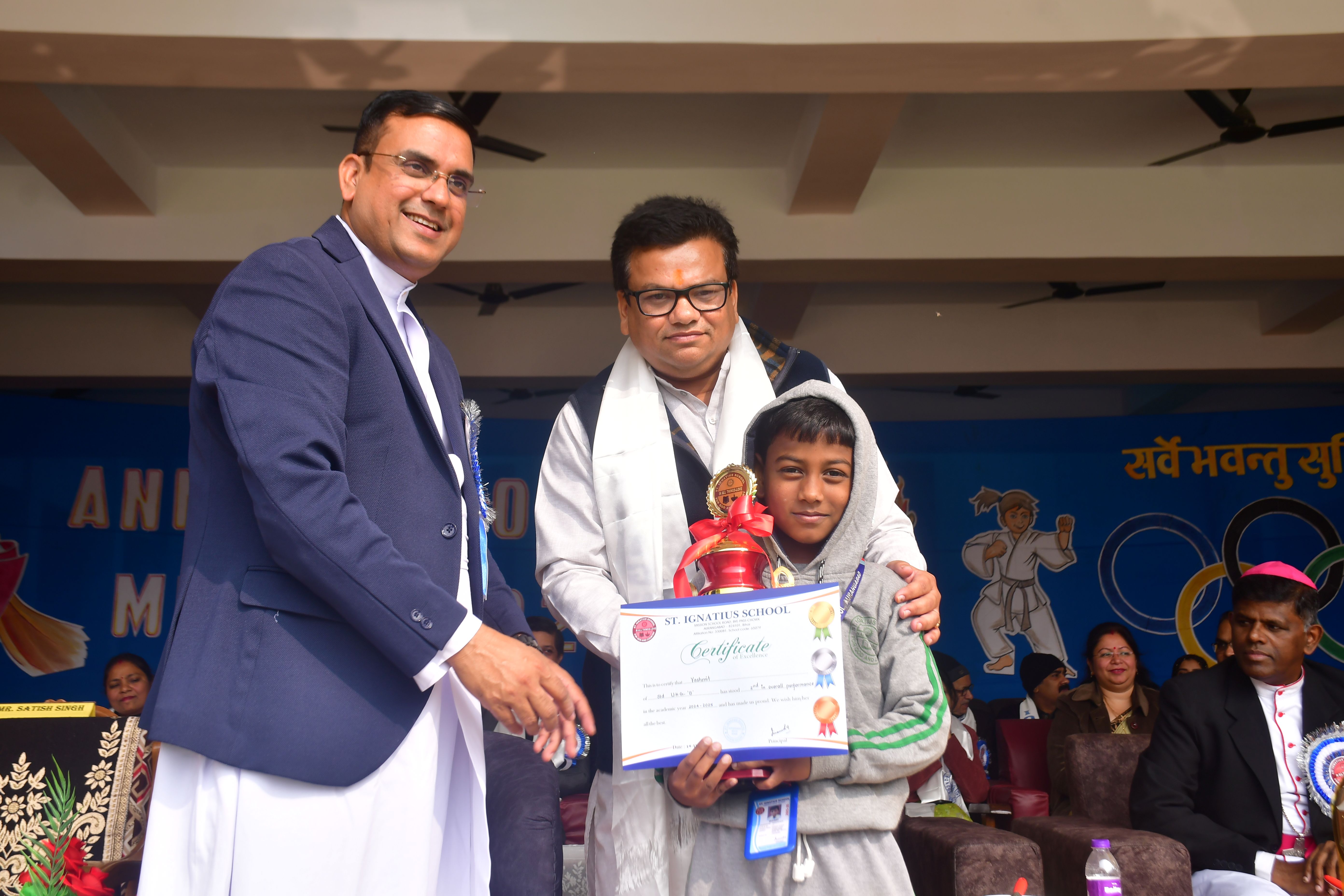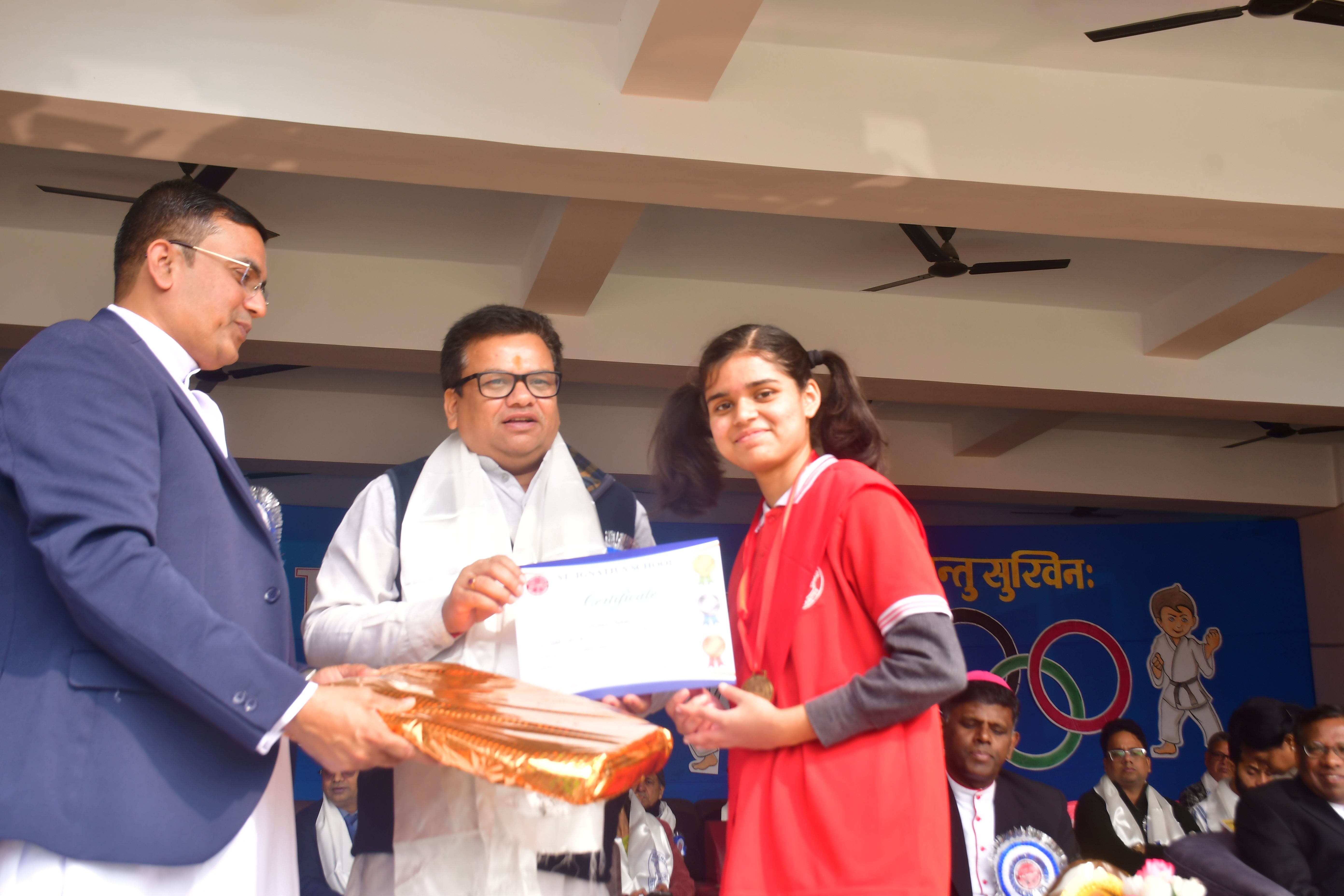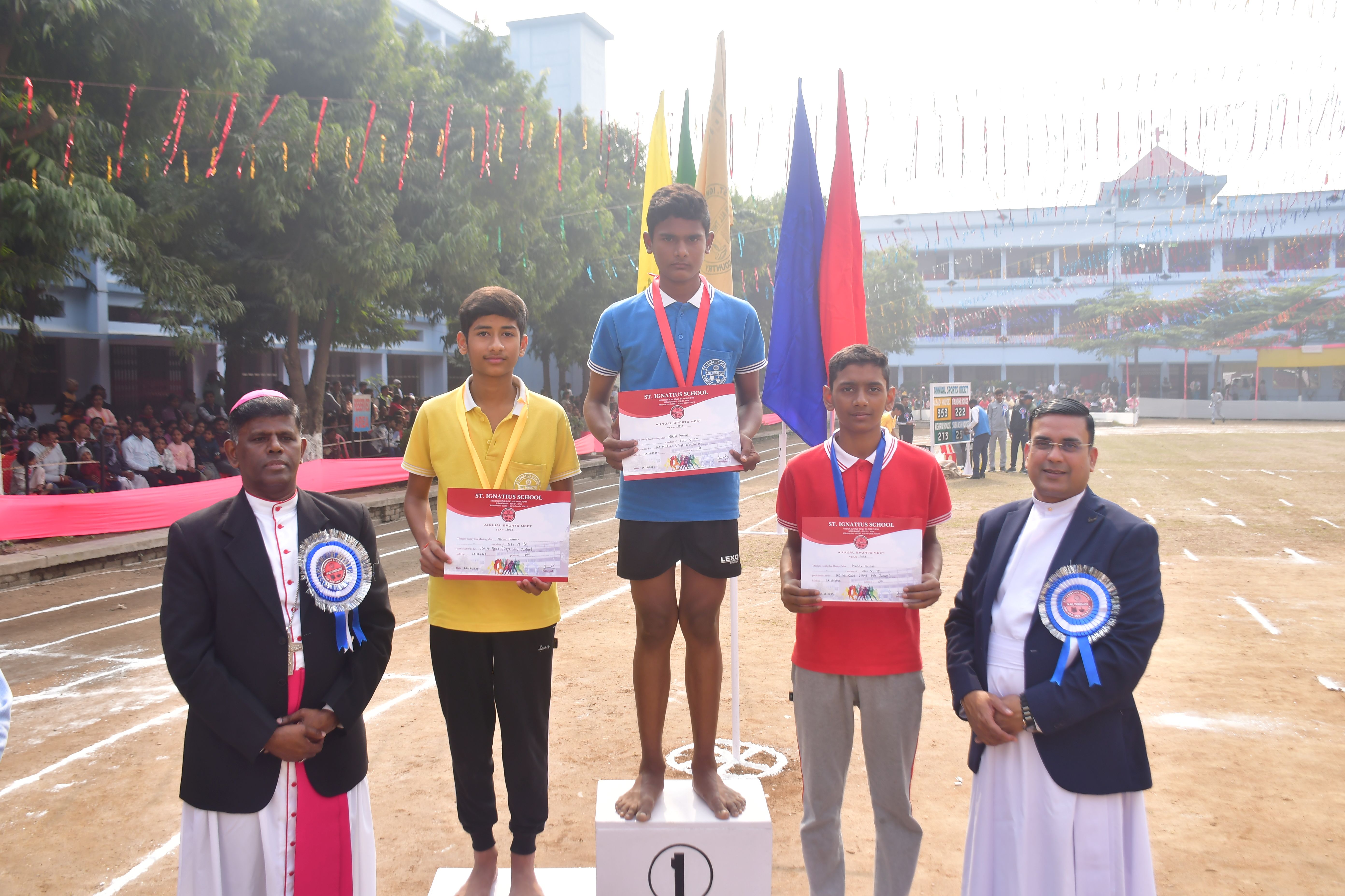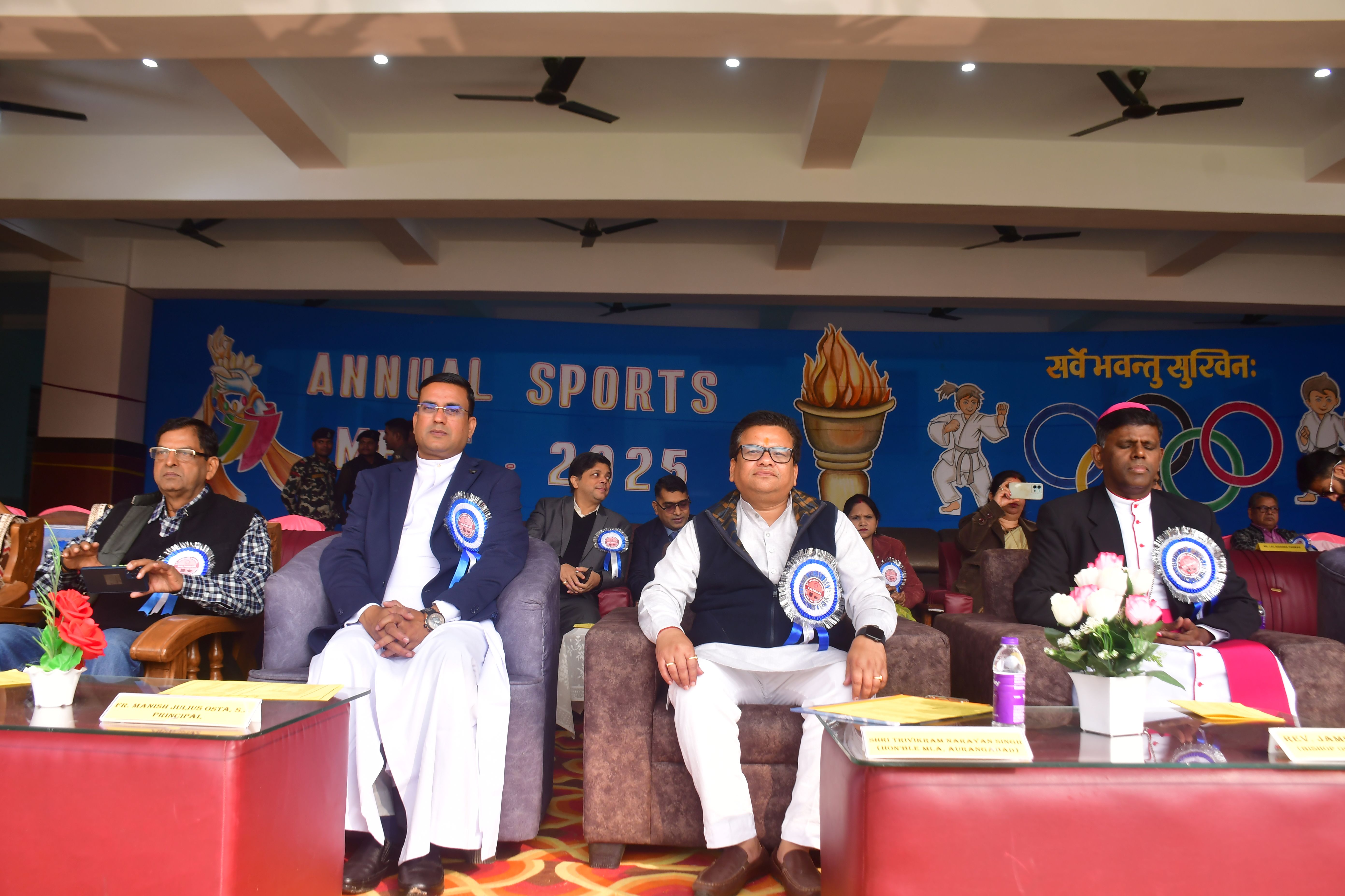 After three years of gap Annual Sports Meet was held in our School on 14th December 2025 with great pomp and joy. The program began at 10.30 am. The Chief Guest of this mega event was the most honourable MLA of Aurangabad. Fr Manish Julius Osta, the Principal, Fr. Raj Kumar, the Secretary of the School, Fr Victor Osta, the Counsellor, Fr. John Ravi, the Treasurer along with other dignitaries were escorted by the different House Captains to the dais with a lovely drum beats. The other dignitaries were felicitated by Fr. Principal, Fr Secretary and Fr. Treasurer. The chief guest of the day declared the Annual Sports Meet 2025 open and a bunch of tri colour balloons was released in the air. There after a colourful and magnificent March past was displayed by four houses namely Azad, Gandhi, Nehru and Subhash under the leadership of Mr. Joseph James, the School PT teacher. The march past was followed by mesmerizing aerobics performed by the students of standard 6, 7 and 8. The other attractions of the day were drills, pyramids, 100 m, 400 m, 800m, 4× 100 m relay races for both senior and sub junior students. The other entertaining events were wheelbarrow race, sack race, biscuit eating, picking the balls, passing the balls and getting ready for school for tiny tots. Tug of war between Gandhi and Nehru house was the culmination of the Mega event. Azad House was the winner of the day followed by Azad House. Gautam Kumar of X B, was the overall champion. At the end the trophies were given away to the winner and the runners-up. Fr. Raj Kumar proposed the vote of thanks. Thus, the mega event came to an end at about 2.00 pm. A large number of parents witnessed the sports extravaganza. It was one of the most successful events of the year 2025.